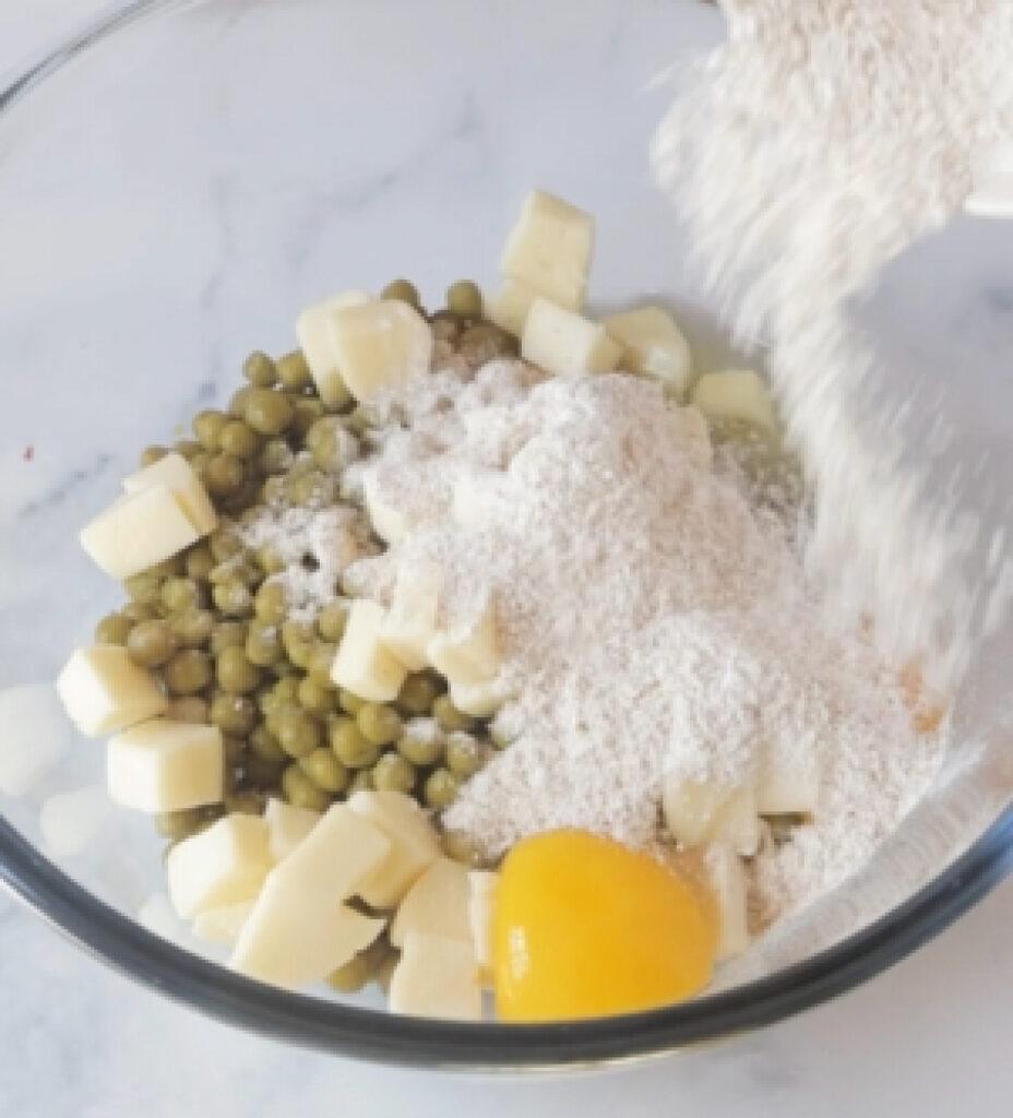 Sumá el queso cortado en cubitos, los huevos, la menta picada, la harina integral y el polvo para hornear.
