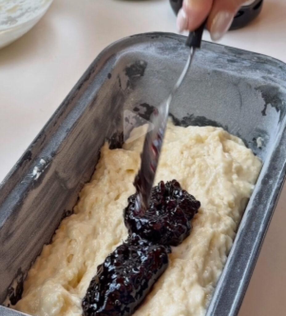 Volcá la mitad de la preparación en una budinera enmantecada y enharinada o forrada con papel manteca. Colocá la mermelada de zarzamora en el centro y cubrí con el resto de la mezcla.