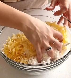 En un bowl, mezclá la fécula de mandioca, los quesos rallados y la sal.
