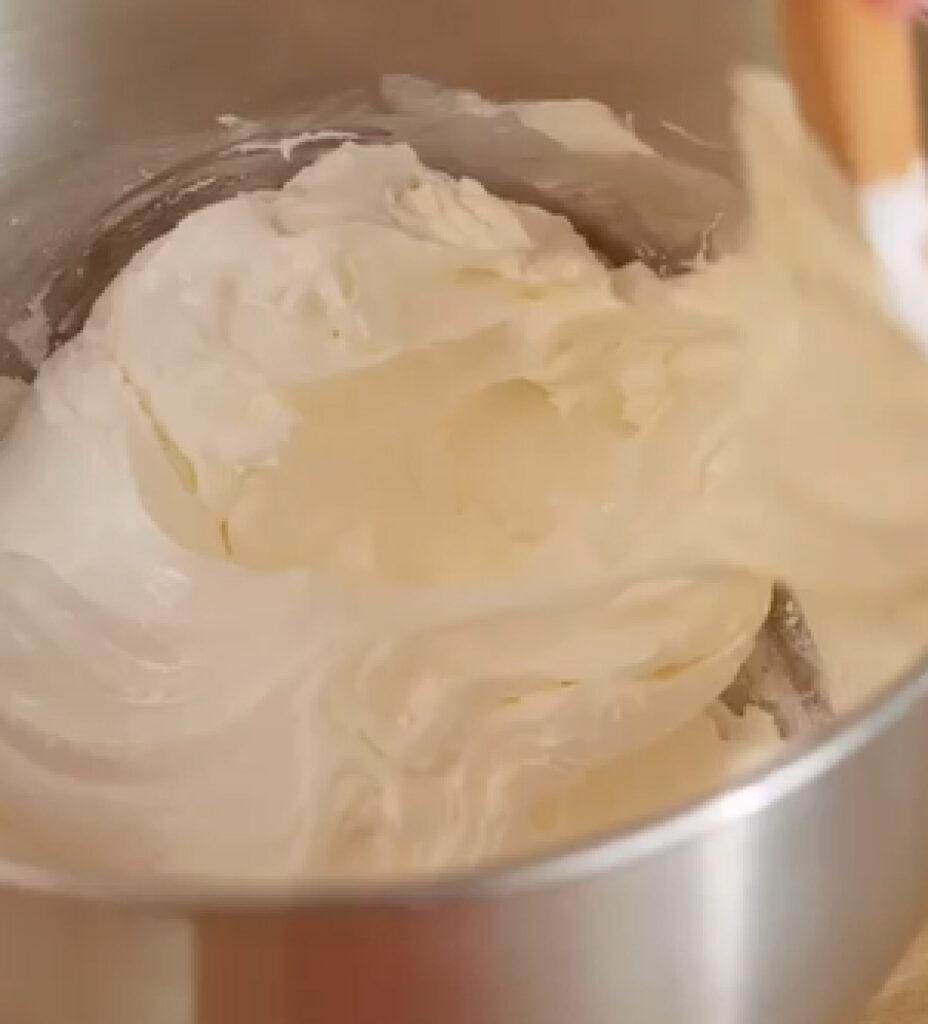 Batir la crema con el azúcar y la vainilla hasta lograr un punto suave y aireado.