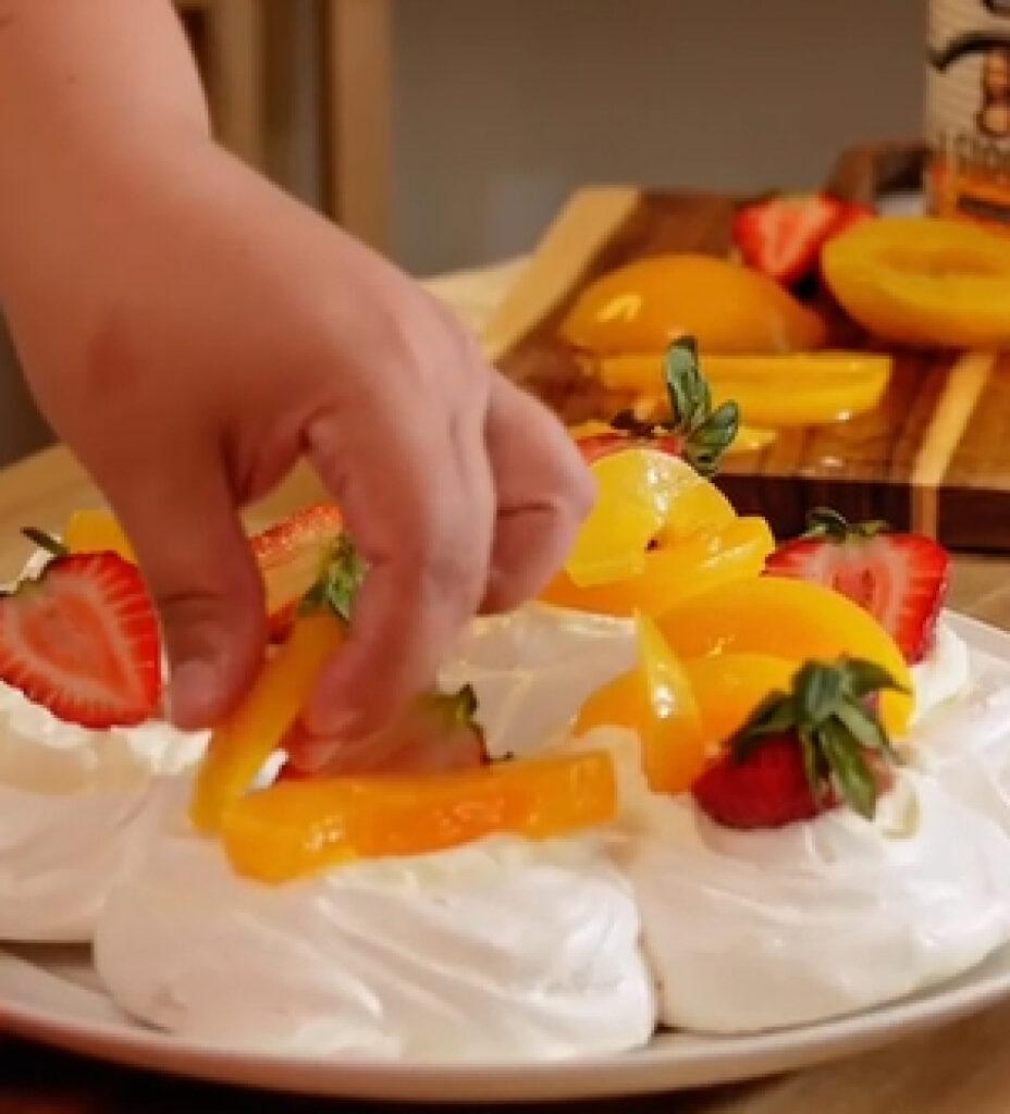 Colocar la crema sobre la pavlova ya fría y completar con duraznos en almíbar La Gioconda.