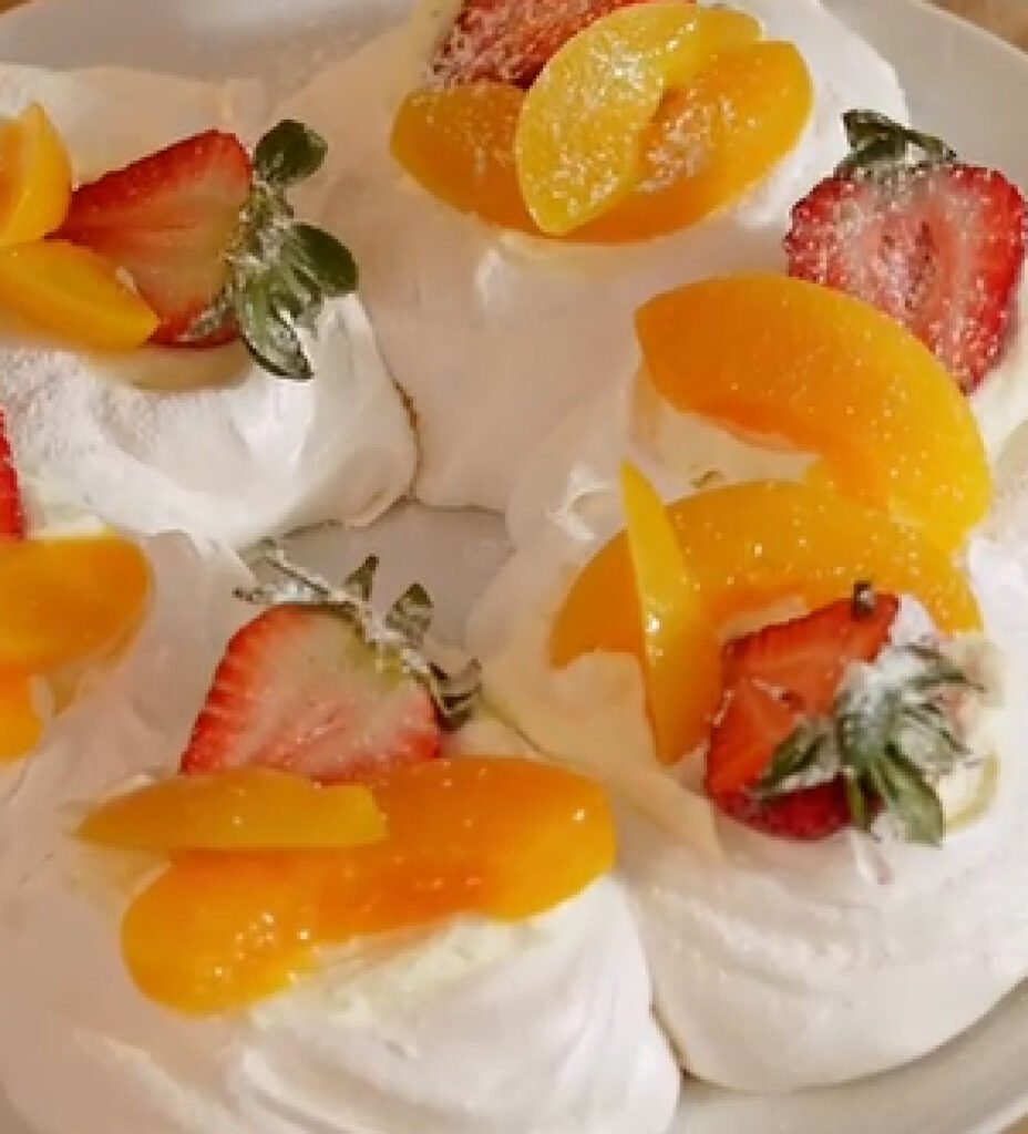 Liviana, delicada y visualmente irresistible, la pavlova casera es un postre que combina texturas de manera perfecta: crocante por fuera, suave por dentro y coronada con una crema aireada y duraznos.